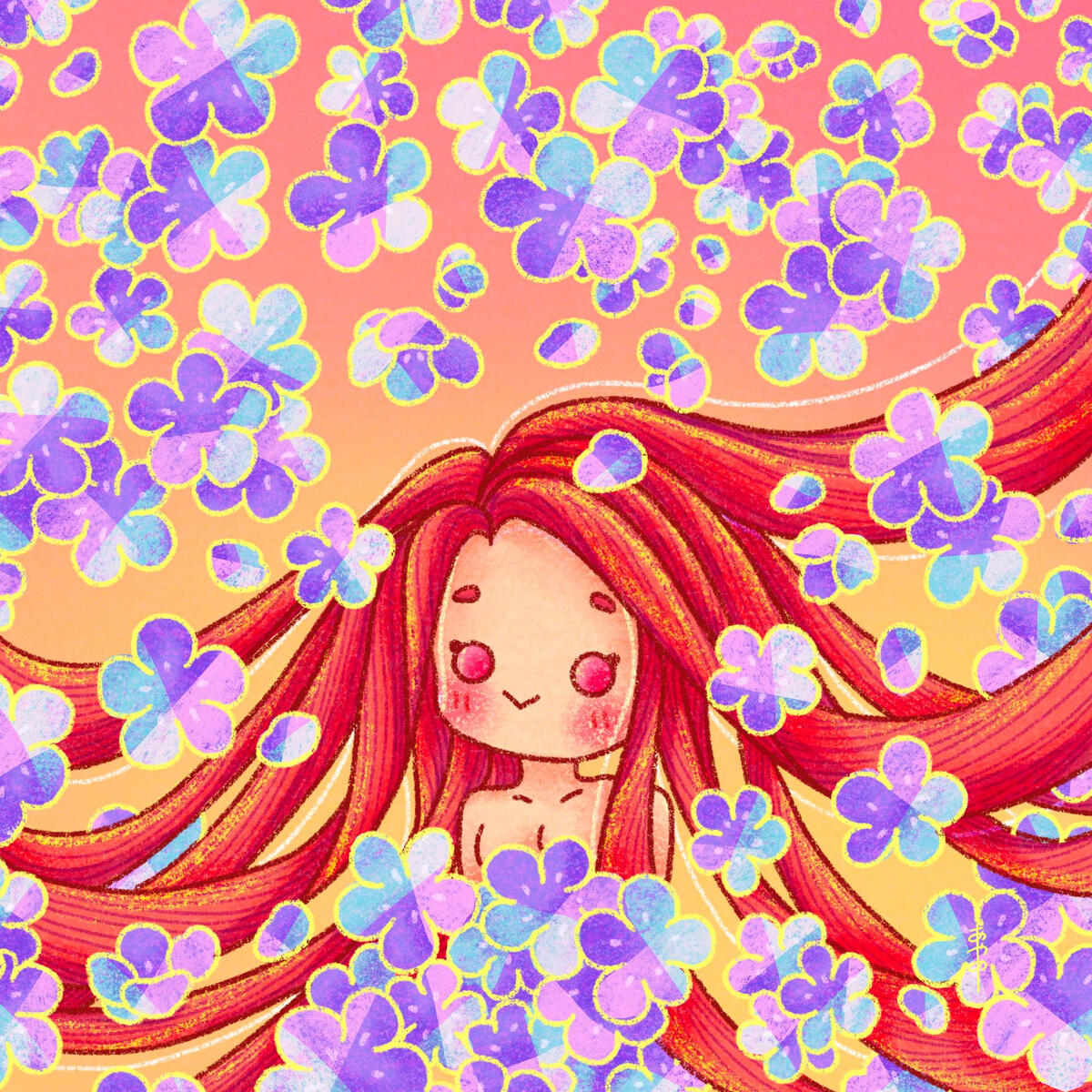 Simple background colorThis style focus on character's hair flow and the flowersDetail to inform